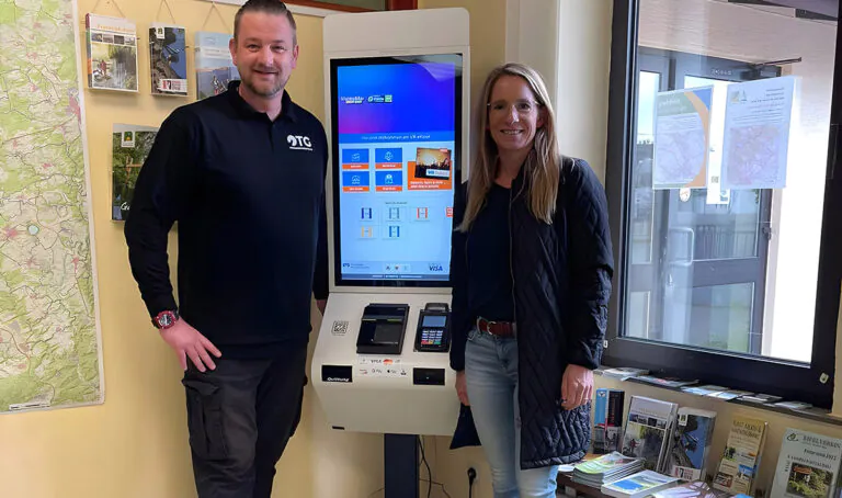 An den Kioskterminals POLYTOUCH® CURVE, POLYTOUCH® FLEX21.5 und POLYTOUCH® PASSPORT 32 (im Bild) von PYRAMID können Besucher von Tourist-Informationen ab sofort in Selbstbedienung Gutscheine für Apps, Spiele, Shopping-, Musik- und Veranstaltungstickets erwerben.